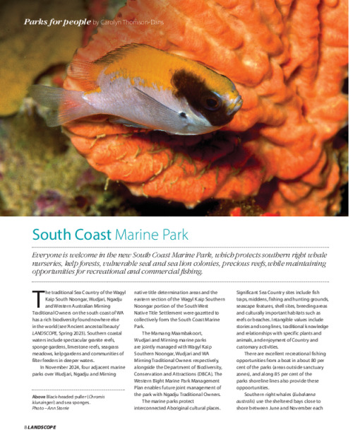 The traditional Sea Country of the Wagyl Kaip South Noongar, Wudjari, Ngadju and Western Australian Mirning Traditional Owners on the south coast of WA has a rich biodiversity found nowhere else in the world (see ‘Ancient ancestral beauty’ LANDSCOPE, Spring 2023). Southern coastal waters include spectacular granite reefs, sponge gardens, limestone reefs, seagrass meadows, kelp gardens and communities of filter feeders in deeper waters.