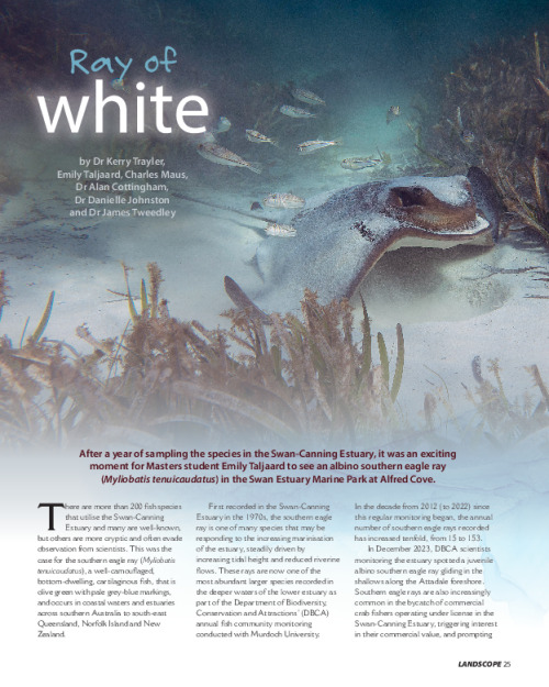 In December 2023, DBCA scientists monitoring the estuary spotted a juvenile albino southern eagle ray gliding in the shallows along the Attadale foreshore.