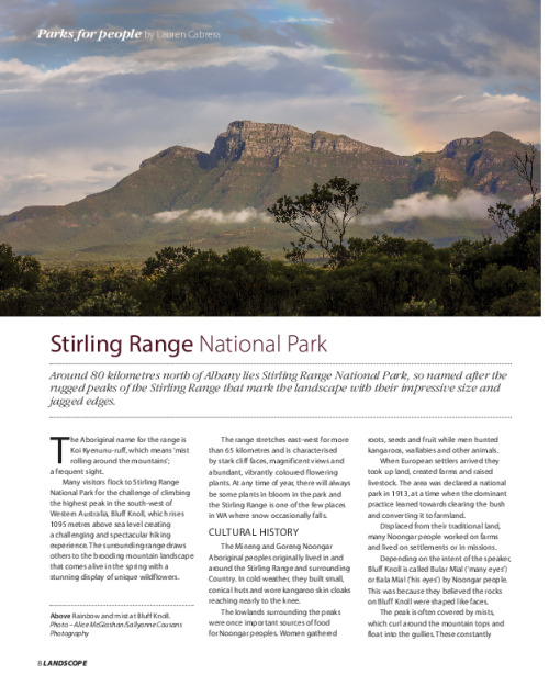 The Mineng and Goreng Noongar Aboriginal peoples originally lived in and around the Stirling Range and surrounding Country. In cold weather, they built small, conical huts and wore kangaroo skin cloaks reaching nearly to the knee.