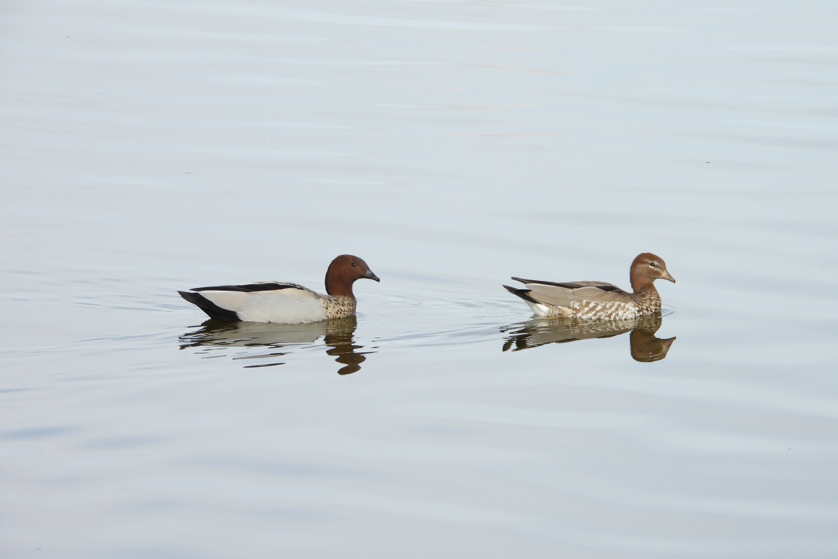 Many ducks, when seen from a distance, can appear dark, dull and hard to identify. To make identification even more difficult, the males and females of some waterbirds, such as Australian wood ducks, look different. The female has a light brown head and neck, with eyes highlighted by pale white stripes. The male has a rich dark-brown head and neck.